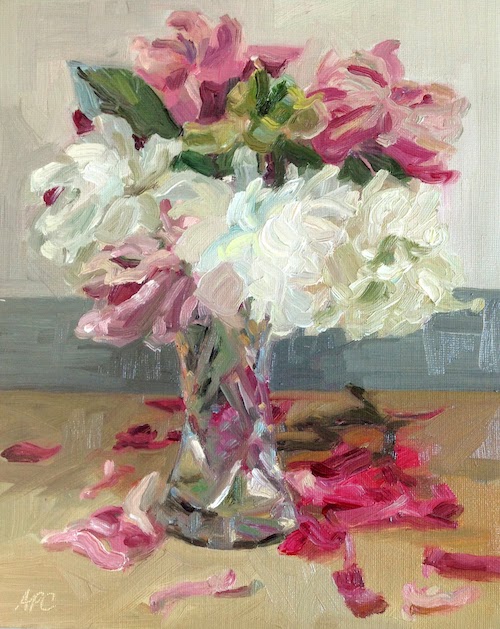 I loved the look of the aging peonies, but just sticking them in the vase caused an event: petalfall!